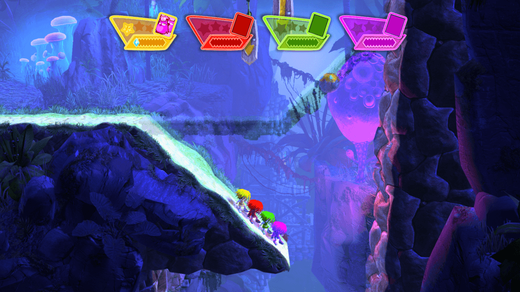 The maps have minimal branching paths but are primarily 2D loop courses. Players who fall too far behind are eliminated until only one player remains in the lead, earning a point, and the race restarts. The first player to accumulate the required points wins the overall match. There is no significant cross-progression, item unlocks, or similar features – it’s a straightforward gameplay experience.
